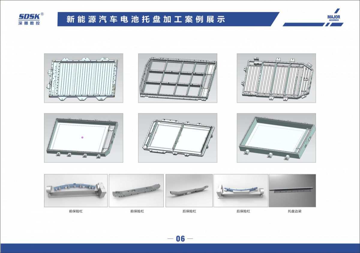 應用加工領域:新能源電池托盤加工/航空航天細長零配件/機翼配件磁懸浮高鐵行李架/電池盒/鋁通風裝置/燈源主體前燈鋁制品